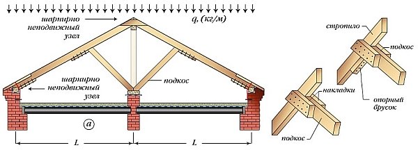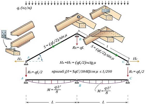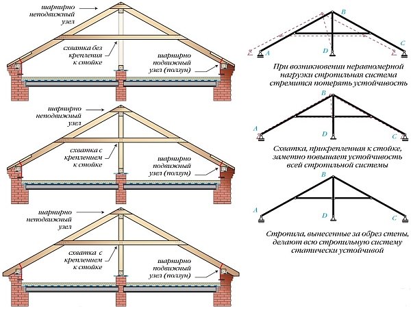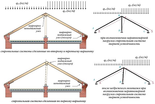 Способ работы стропильной системы будет зависеть от того, какие соединения являются шарнирными, а какие из них работают в жестком режиме.