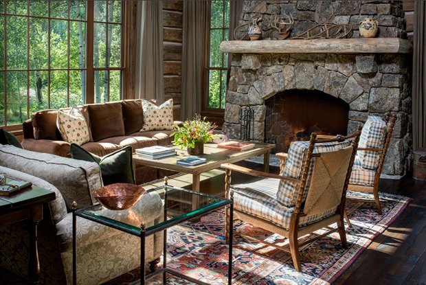 Это обилие натурального дерева с проглядывающей фактурой, скошенные потолки, тёплые тона, каменные фартуки на кухне и в каминной зоне, кожаная мебель, деревянные балки на потолке и всё, что так или иначе связано с таксидермией: головы животных и шкуры на полу. У нас такими чаще всего хотят видеть загородные дома, что объяснимо. Хотя иногда отдельные элементы могут отлично дружить и с интерьерами в других стилях.