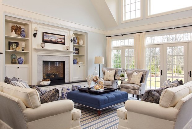 Обязательно ровные, со штукатуркой и покрашенные в белый. Используют или чистые белоснежные тона, или же колорированные варианты с небольшим розовым, голубым оттенком. Рекомендуется красить стены, двери и рамы окон в белый, чтобы они служили основой для дальнейшего оформления гостиной мебелью и аксессуарами.