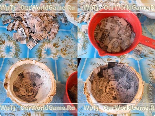 Пропитав бумажные кусочки водой, обкладываем ей нашу гипсовую форму, отступив от края на 1 см.