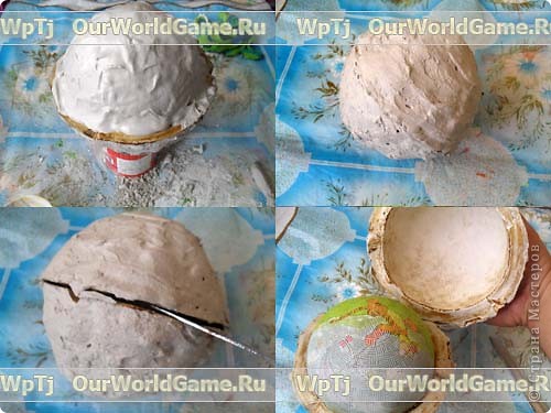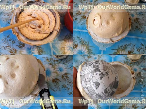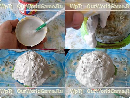 Затем сметанообразным раствором гипса покрываем одну из половинок шара. Дождемся высыхания и, сделав раствор чуть гуще, наносим еще один слой. Так мы обеспечим нашей форме нужную прочность