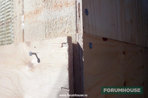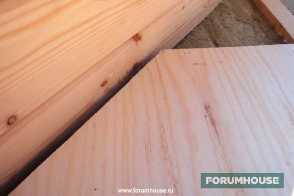 Так как листы фанеры сложно кантовать при креплении, они укладывались встык. Чтобы в дальнейшем избежать возможной деформации и коробления, Bavar прошелся по швам «паркеткой» – получился компенсационный зазор около 3 мм. Для полной подстраховки в местах стыка бруса еще и пропил по всей длине, глубиной 5-7 мм – это поможет избежать напряжения от кручения.