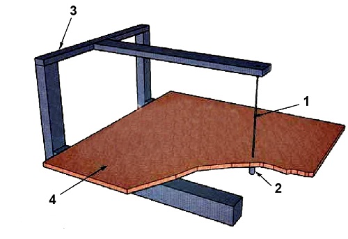Изображение 2. Схема вертикального резака: 1 – режущая нихромовая проволока, 2 – груз, 3 – рама, 4 – рабочая поверхность.