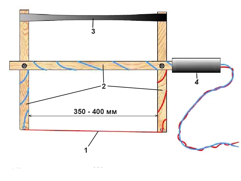 Его основа — рама из деревянных брусков (2), скрепленных шарнирно. Между нижними концами вертикальных брусков натянута режущая проволока (1). В натянутом состоянии она поддерживается резиновым жгутом или пружиной (3). При работе инструмент держат за ручку (4).