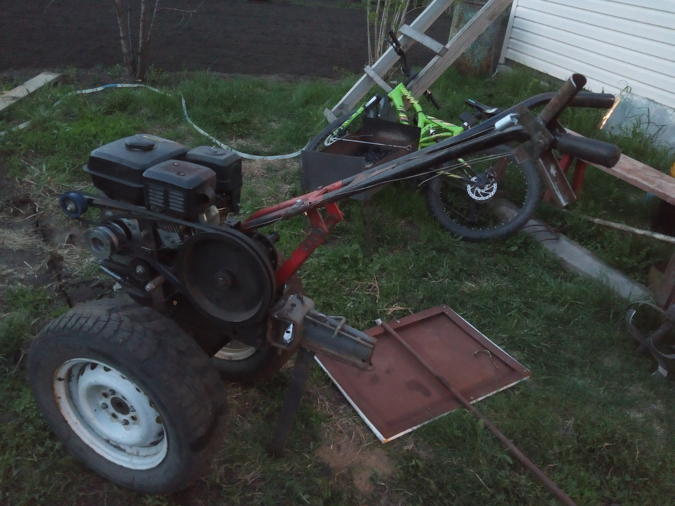 Собрал мотоблок в кучку, установил колеса. Первые ходовые испытания прошел удачно, передвигаясь по двору.
