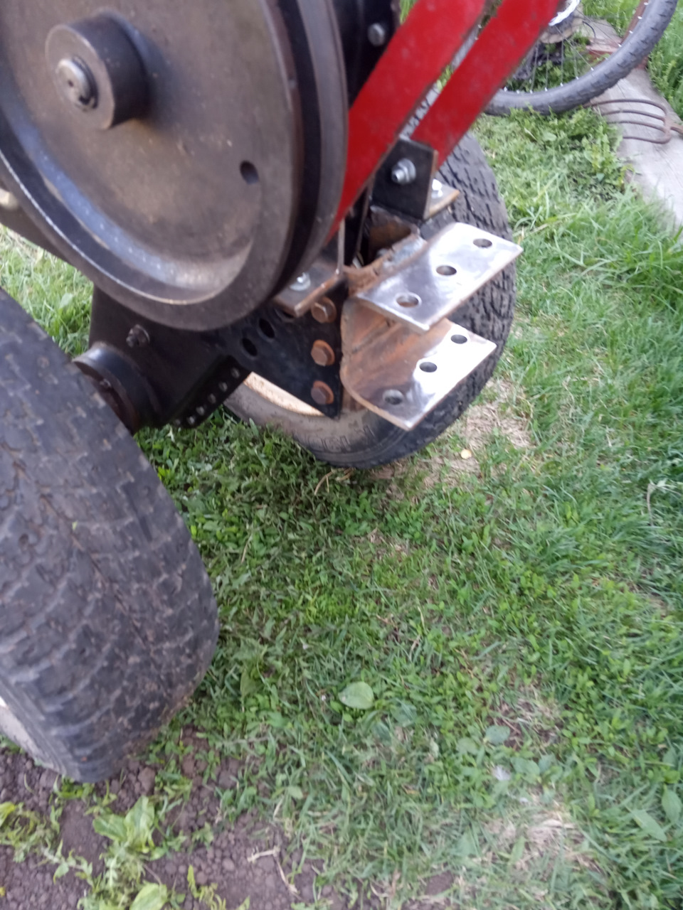 Привернул руль, токарь изготовил удлинители колес, из толстостенной трубы. Флянцы для крепления колес взял с немецкой сеялки с ступиц срезал.