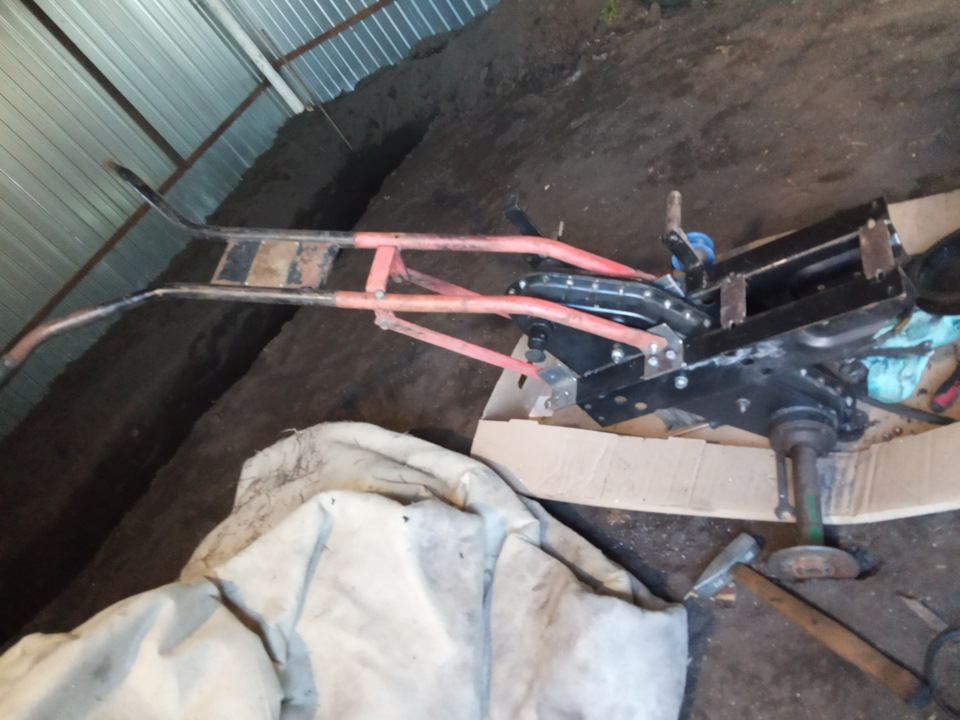 Сначало начал без задней скорости пахать. Просто не возможно это делать. Мотоблок очень тяжёлый. Изготовил ручки самодельные из труб от глушителя. Всё работает как заводское.