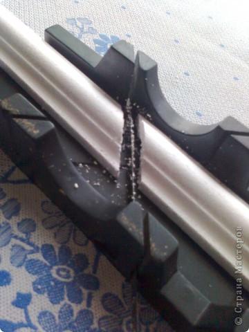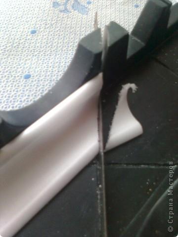 Теперь берём настенный плинтус, который в данном случае будет выполнять роль окантовки «чашечки» и режем на стусле. Обратите внимание, что плинтус лежит в одной плоскости.