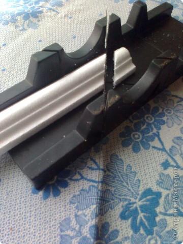 3. Потолочный плинтус разрежьте на 4 отреза, которые будут по размеру соответствовать вырезанному каркасу. Будьте внимательны и аккуратны, плинтус изготовлен из достаточно хрупкого пенопласта. Разрезать следует острым ножом на ровной поверхности, не надавливая сильно на поверхность плинтуса.