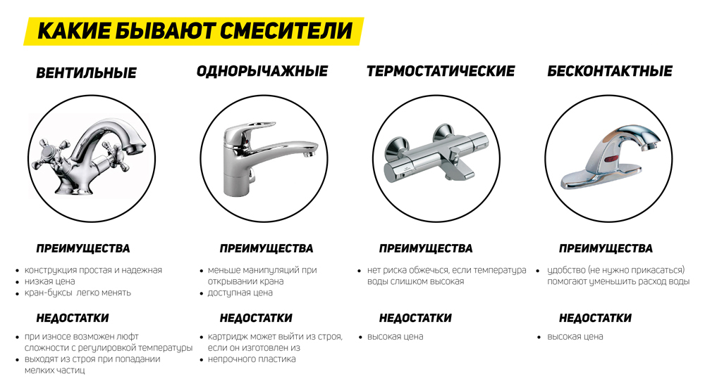 - как осуществляется управление (рычаг, вентиль, сенсор, форма и расположение);