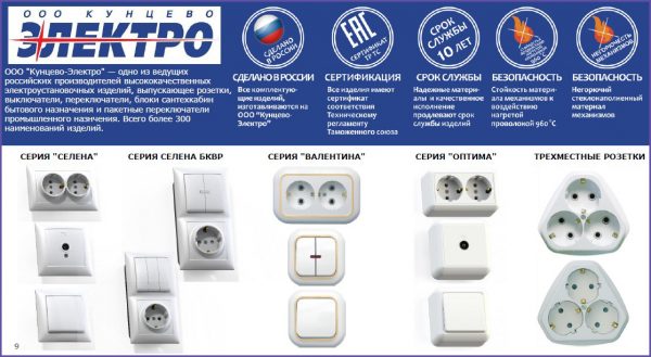 Ассортимент продукции впечатляет: выключатели, розетки, накладки, заглушки и другие сопутствующие товары в классическом или оригинальном корпусе.