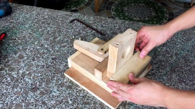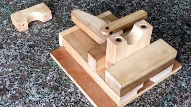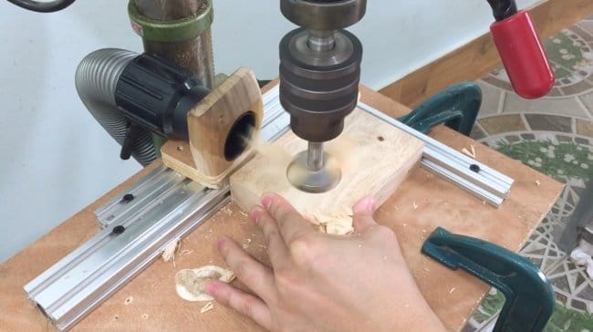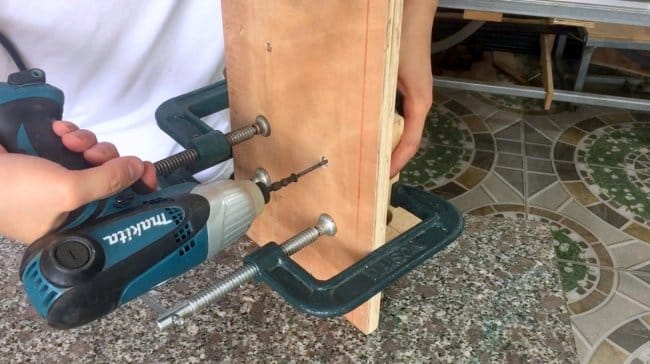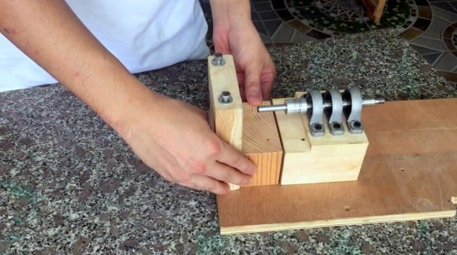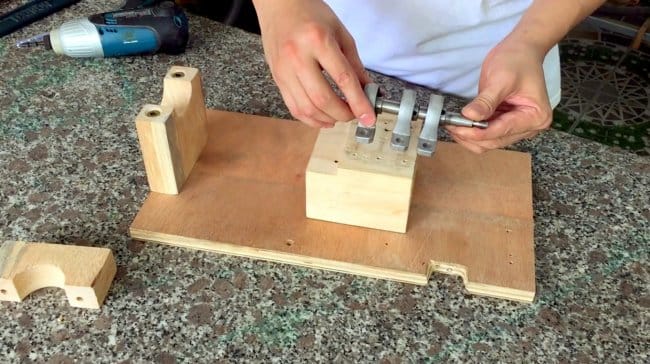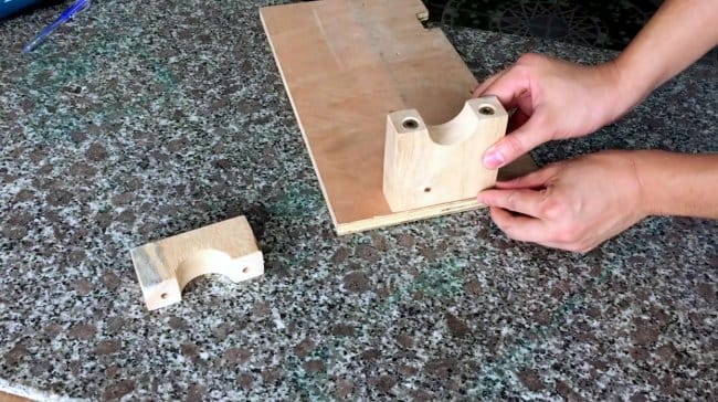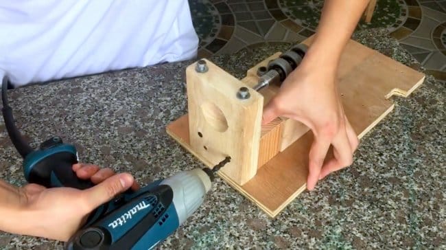 Первым делом мастер изготавливает из достаточно толстой дубовой доски держатель для дрели.