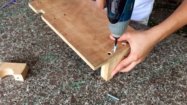 Между держателем дрели и подставкой остался проем, в который нужно вставить подходящий деревянный брусок, и зафиксировать его саморезами.