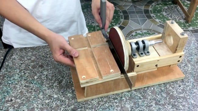 Самый простой способ создания дискового станка — закрепленная на столе электродрель с установленным шлифовальным кругом. Другой доступный вариант — изготовление и установка шлифовального диска на вал циркулярной пилы. При этом, надо собрать устройство для уменьшения скорости вращения (система понижающих шкивов или электронное устройство).